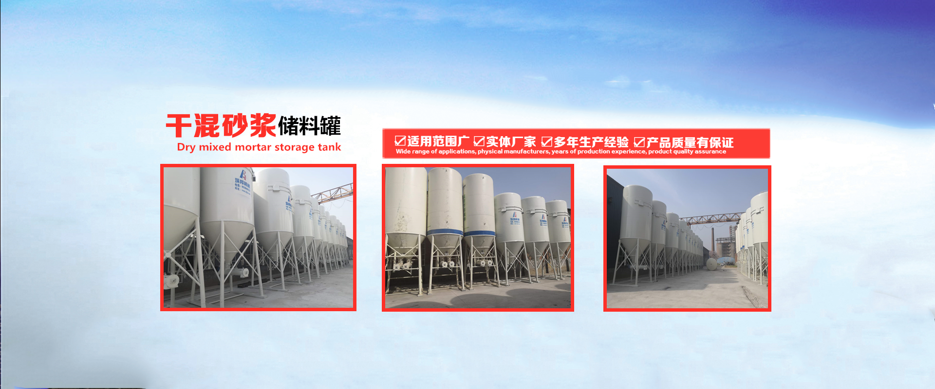 主要產品有:干粉砂漿罐 干粉砂漿設備 干混砂漿儲料罐 干粉砂漿生產線 干混砂漿攪拌機 連續式干粉砂漿攪拌機、砂漿連續式攪拌器及配套控制系統、砂漿輸送泵、砂漿噴涂機、預拌砂漿GPS管理系統、砂漿保水增塑劑等一系列產品,同時為砂漿企業提供專業的投資咨詢、建廠指導、上門制作砂漿罐、技術培訓等一條龍服務。